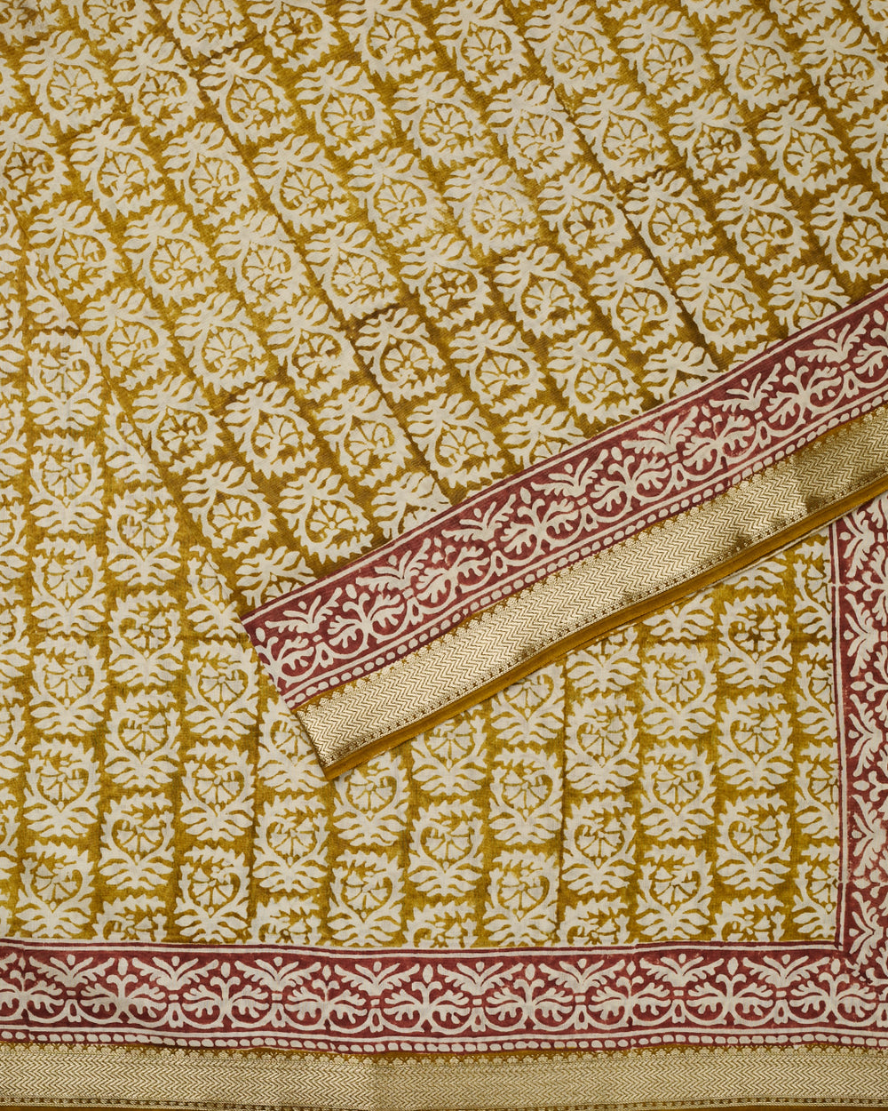 Traditional motifs like paisleys, floral vines, and geometric patterns are often woven with gold or silver zari for added elegance to a green Banarasi saree.