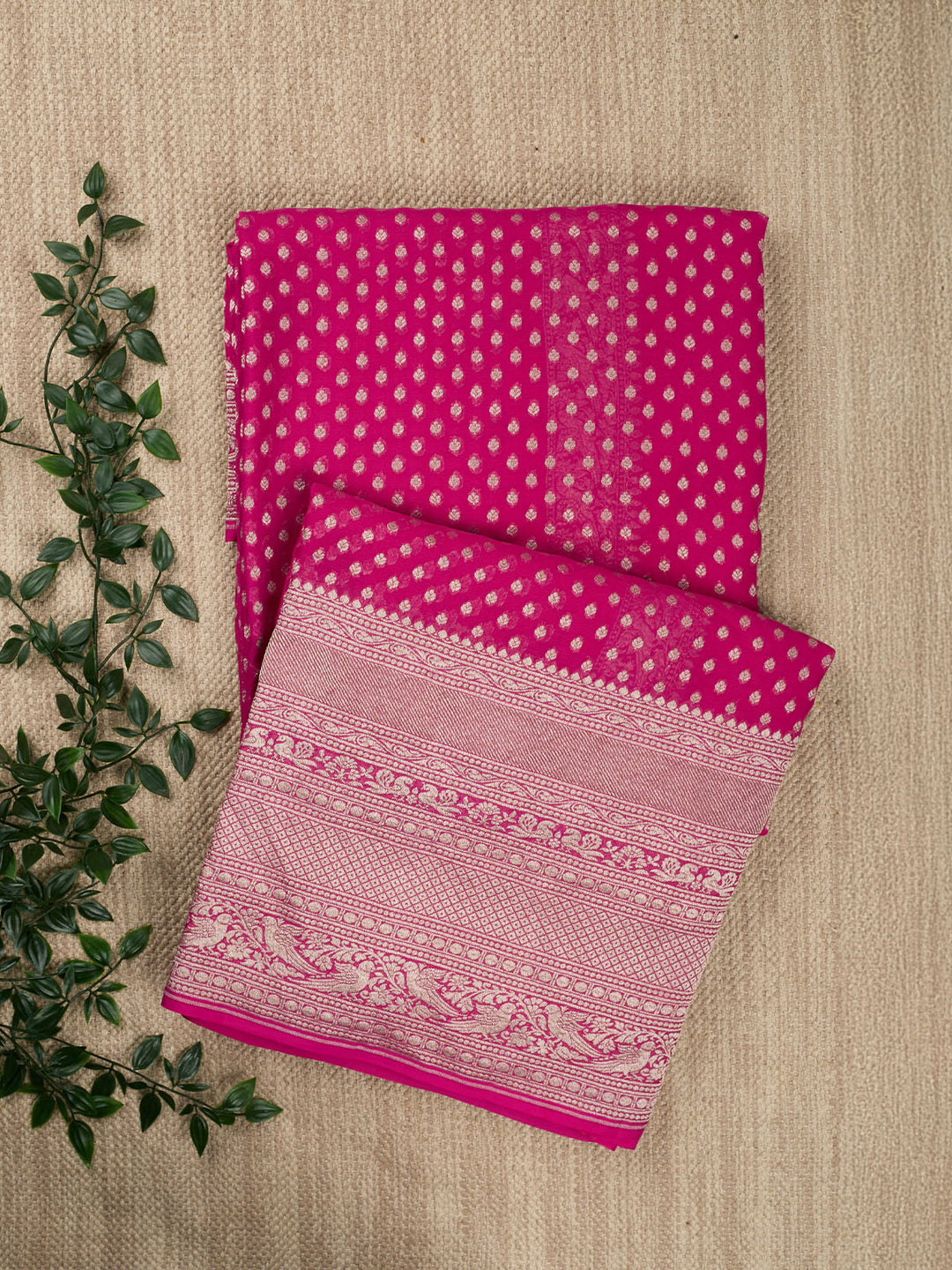 Priyuja’s sarees are woven with rich zari designs and superior silk, focusing on elegance, tradition, and quality. Each Pink Banarasi saree is a reflection of skill, design, and premium quality.