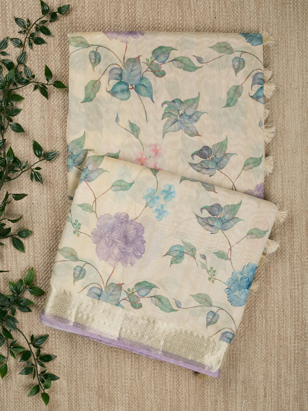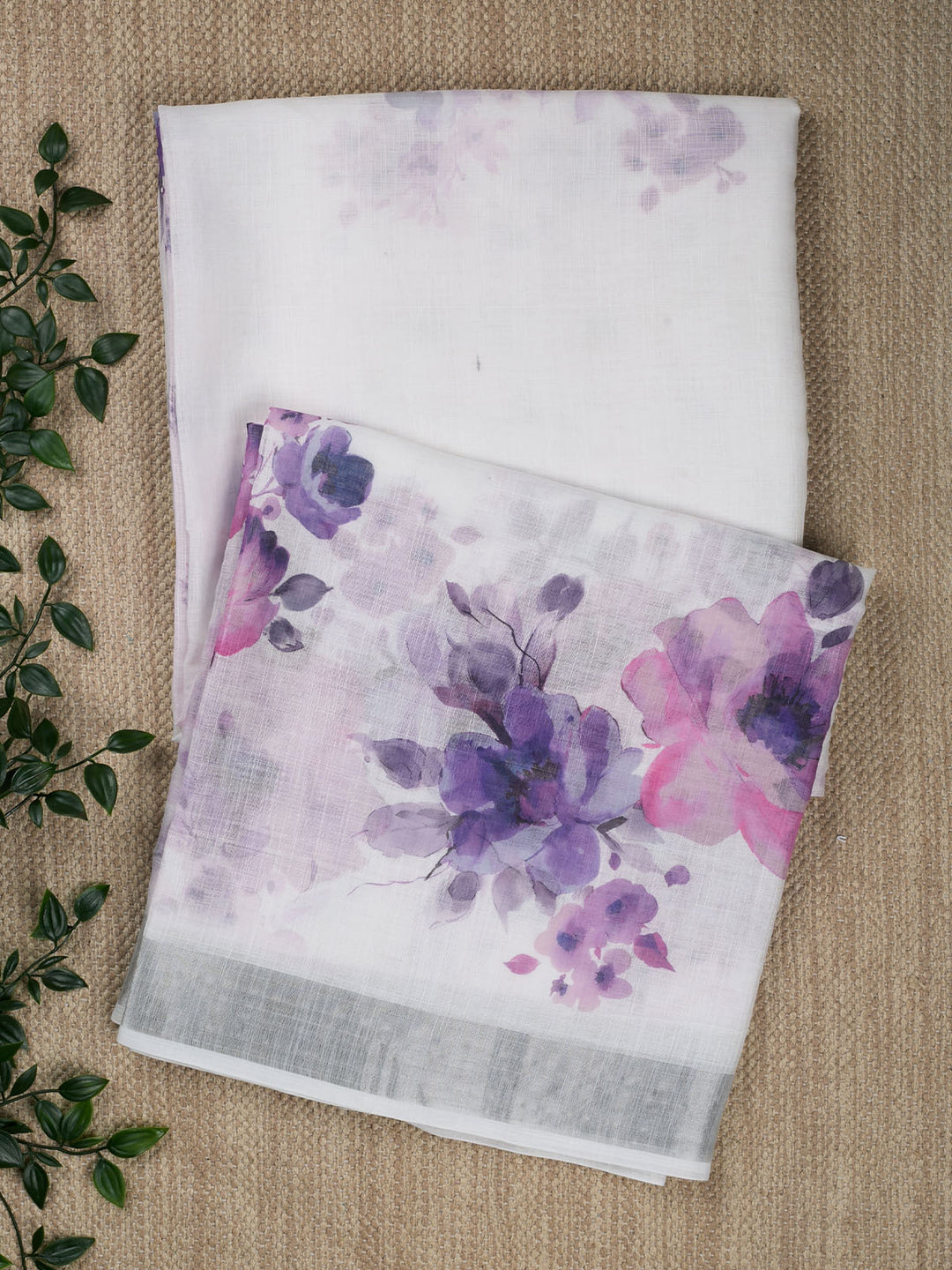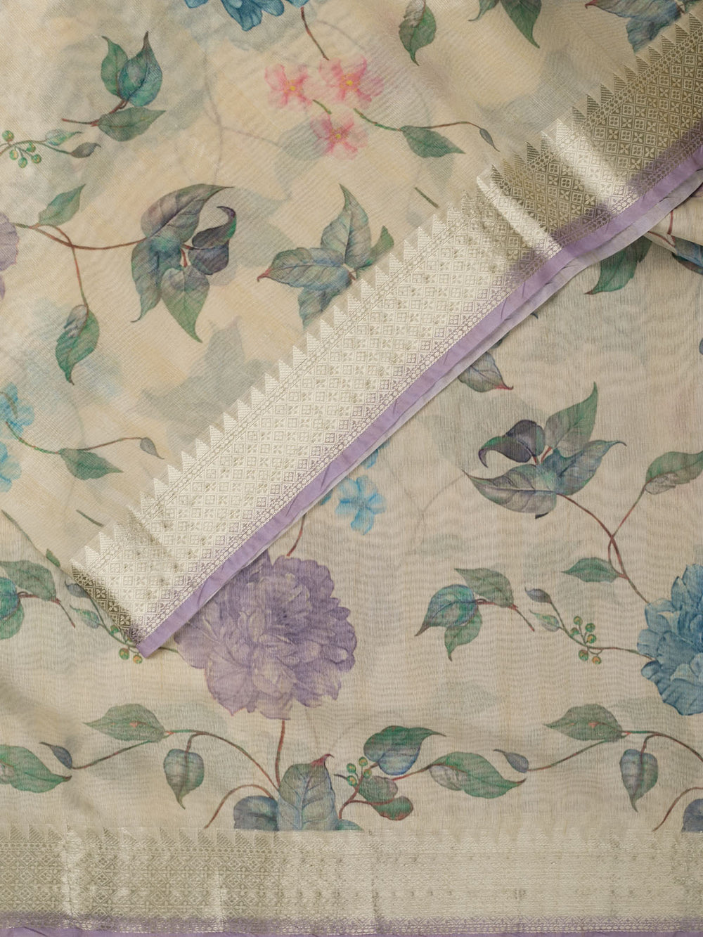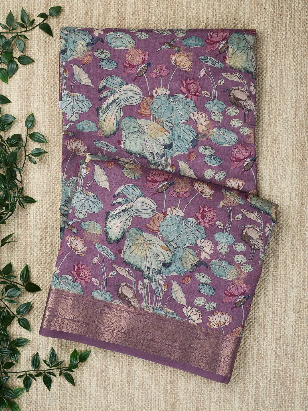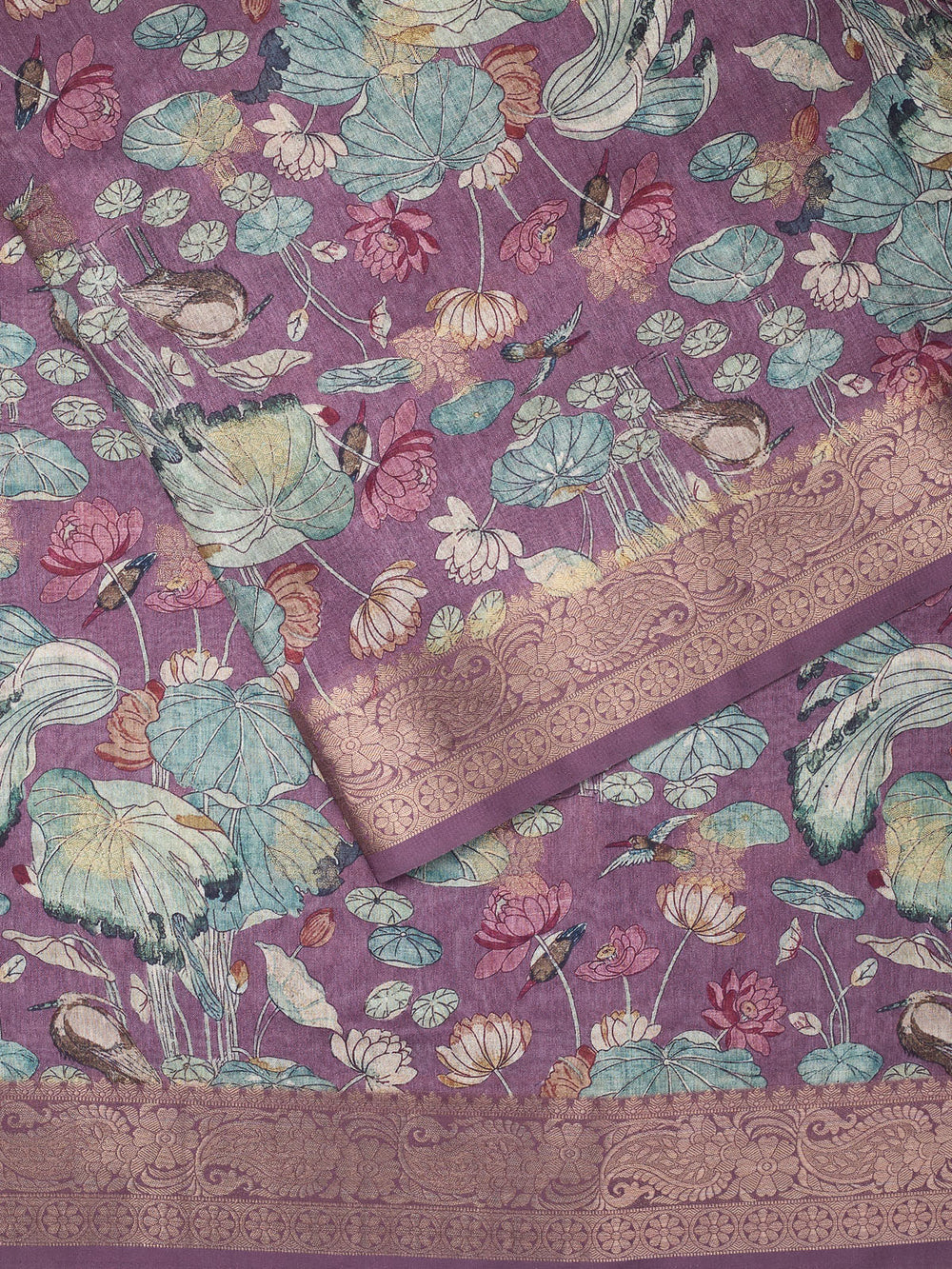 Traditional motifs like paisleys, florals, and geometric patterns in gold or silver zari are found on a purple banarasi silk saree. They are often enhanced with vibrant multi-colored threads that create stunning visual appeal.